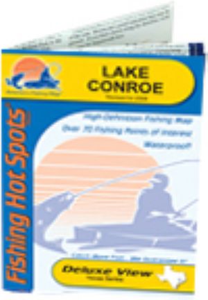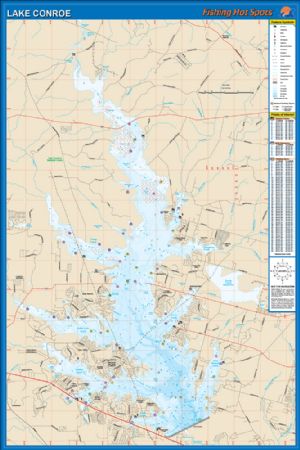 Lake Conroe, Texas Waterproof Map (Fishing Hot Spots)Lots of white bass and largemouth. Heavily stocked lake. Crappie and channel cat numbers good. This map is clean, easy-to-read, and detailed map of the lake. It has a latitude/longitude grid and GPS coordinates. Fishing tips and techniques are included. Size - 24 x 36